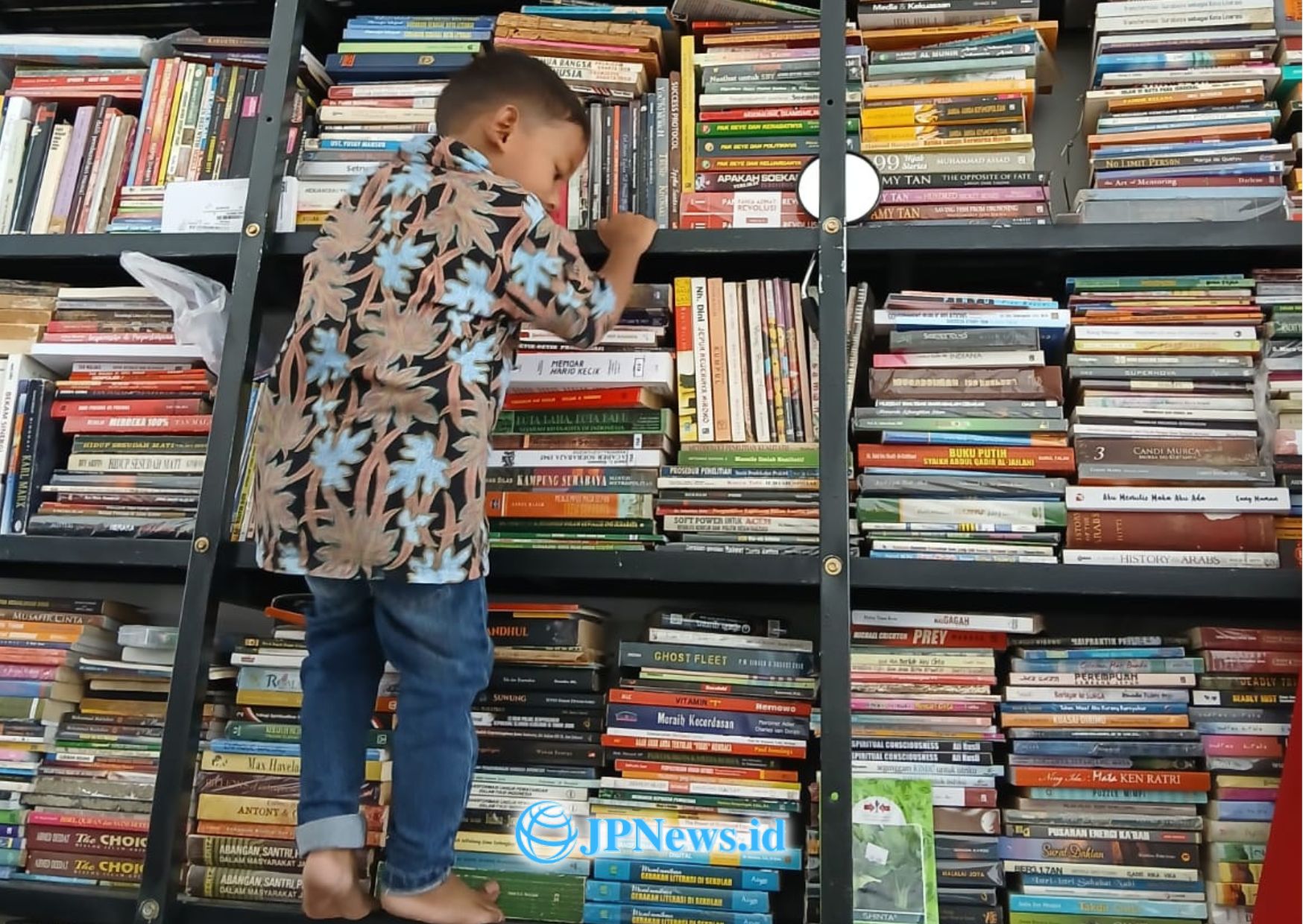 SIDOARJO (JP) – Pemandangan unik anak-anak memanjat rak buku setinggi 3 meter tersaji dalam kegiatan “Rujukan dan Rujakan Literasi”